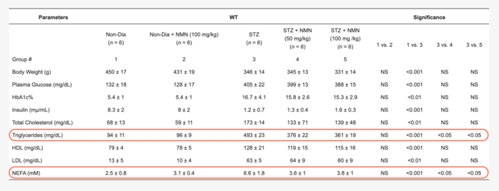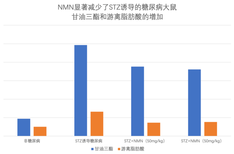 马里兰这项大学的研究,正是在对糖尿病相关的研究过程中,发现了NMN对血脂异常的益处。 三.NMN降脂作用明显 马里兰大学的研究者用链霉素(STZ)或高脂饮食(HFD)诱导实验大鼠或小鼠糖尿病外周神经病变,并导致血液中的胆固醇、甘油三酯和游离脂肪酸水平显著的提高。 随后,他们就使用了NAD+前体(NMN或NR),来研究NAD+ 水平提升后带来的改善。 1、NMN显著降低了由链霉素诱导的甘油三酯和游离脂肪酸的增加 研究者们对链霉素(STZ)诱导的大鼠,连续进行了2个月腹腔注射NMN 50mg/kg或100mg/kg。 然后从数据可以判断出,NMN显著地降低了由STZ诱导的甘油三酯和游离脂肪酸增加。