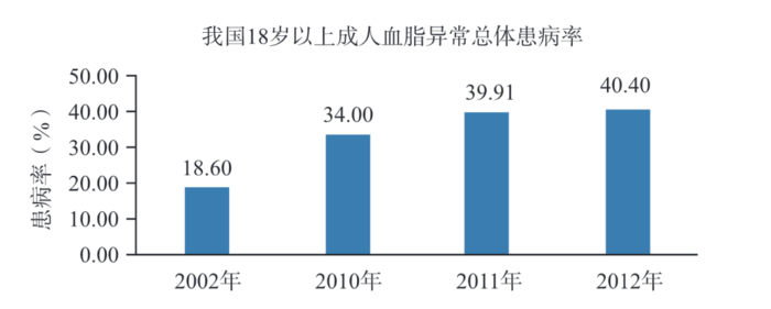 一.中国成年人超四成血脂异常 随着生活水平的提高和饮食结构的变化,许多中国人的血脂水平都在上升,进而发展为高脂血症。(也就是我们通常所说的高血脂) 根据《中国成年人血脂异常防治指南(2016修订版)》,2012年全国调查结果显示:中国成年人血脂异常总体患病率已达40.40%,相较2002年的18.6%,呈现超大幅度上涨。