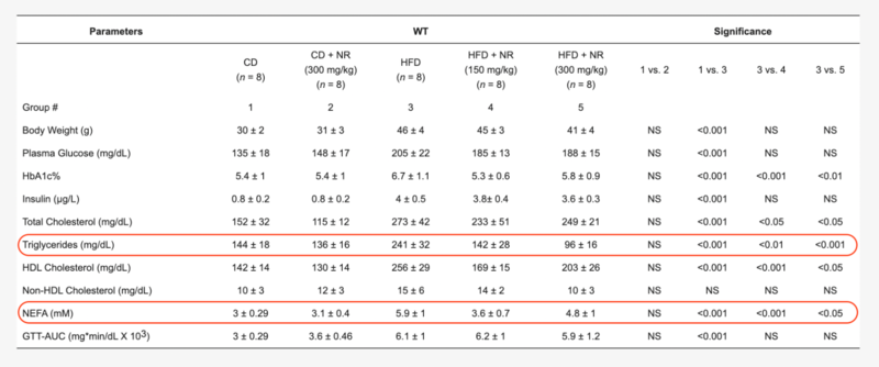 *游离脂肪酸(NEFA):是由油酸、软脂酸、亚油酸等组成,大部分游离脂肪酸与白蛋白结合,存在于血液中。血清中游离脂肪酸的浓度与脂类代谢、糖代谢、内分泌功能有关。过高的游离脂肪酸导致的高游离脂肪酸血症与代谢综合征、动脉粥样硬化、急性冠脉综合征、心力衰竭等疾病的发生发展相关。 2、NMN前体NR显著降低了高脂饮食诱导的甘油三酯和游离脂肪酸的增加 研究者们还用高脂饮食(HFD)下小鼠血脂水平大幅度增加下的使用场景。并使用NMN的前体NR,以150mg/kg或300mg/kg(模拟人类每天服用1000~2000mg的NR的场景)喂养小鼠两个月。 此时通过对比数据发现,膳食补充中增加的NAD+同样抑制了高脂饮食(HFD)诱导的小鼠甘油三酯和游离脂肪酸(NEFA)水平的增加。