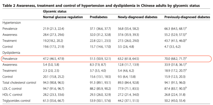随着年龄的增长,血脂异常的患病率呈指数上涨,并且会表现出性别差异。 男性45~60岁达到最高、60岁后略有下降。而女性则是50岁后血脂异常患病率增长迅速、60岁以后超过男性、70岁后略有下降。 简而言之,仅以现有的数据来看,女性应该更加注意的自己的血脂问题。 从目前的研究来看,中国血脂升高的主要原因是饮食问题,大量脂肪类食物(尤其是动物脂肪),会让血脂水平明显升高。 而摄入过多的碳水化合物,尤其是大量的经过精细加工的粮食,不仅会引起血糖的升高,还会合成更多的甘油三酯,带动血脂一起升高。此外,经常吸烟、酗酒以及精神紧张、焦虑,也容易导致血脂的异常。 二.“血脂异常”意味着什么? “血脂异常”主要指血脂检测高于合适水平或异常地低于正常水平。 在我国,为“血脂异常”困扰的人大多数是困扰血脂过高。其表现为高胆固醇或高甘油三脂,且不少人也两者兼有之。 正常水平的胆固醇和甘油三酯,是人体维持正常活动所必不可少的成分。但是主要问题就在于,这些成分一旦过高,对于人体健康就有很大的威胁。 比如人们常说的心血管疾病问题,就往往是因为这两个成分在体内含量过高。具体病症为动脉粥样硬化、冠心病、心肌梗死、卒中、胰腺炎等。 此外高血脂和“三高”中的另外两个——高血压和高血糖也关系密切,往往这三者会同时出现。 中国非传染病检测(CNDS)项目2010年在31个省、市、自治区162个中心≥18岁人群中的抽样调查显示:过往已诊断糖尿病的患者,血脂异常率高达70%。